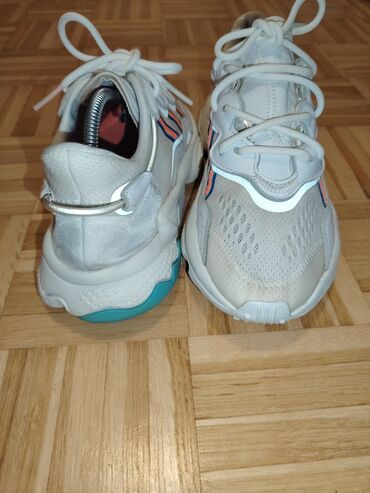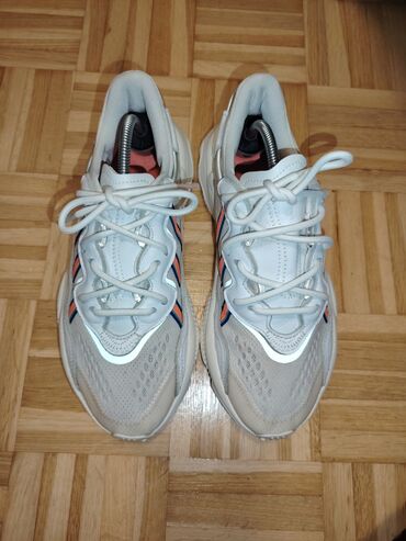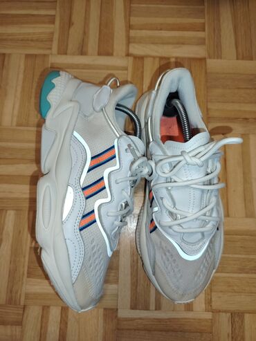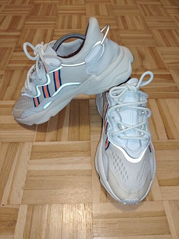 Patike Adidas Ozweego UG 25cm, bele boje sa narandžasto-plavim prugama sa strane.