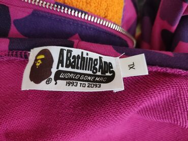 - Dizajn: ljubičasto‑roze camo print, karakteristična “ajkula” sa zubima i očima na kapuljači; na rukavu ušiven BAPE “ape head” tag