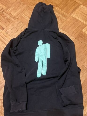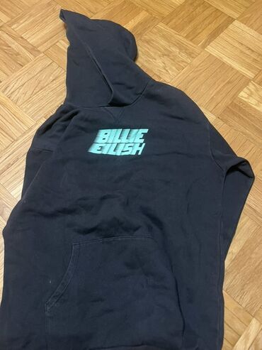 - Prednja strana: mali logotip “Billie Eilish” u tirkiznoj boji sa efektnim linijama; velika kengur džepna torbica