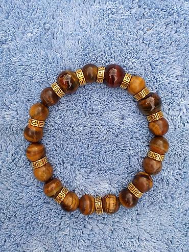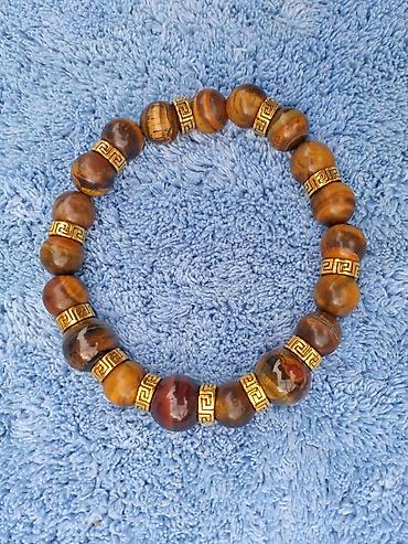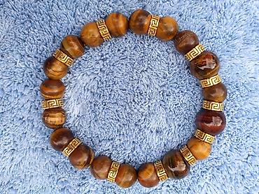 - Materijal: poludragi kamen Tigrovo oko, glatko polirane kuglice u nijansama braon, zlatne i crvenkaste, sa ukrasnim zlatnim distancerima (grčki/meandar motiv).
