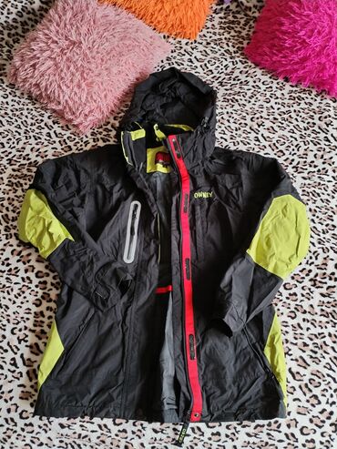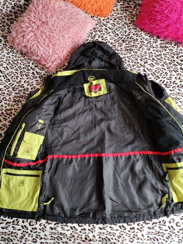 - Tehnička outdoor jakna u crno‑limeta zelenoj kombinaciji sa crvenim akcentima