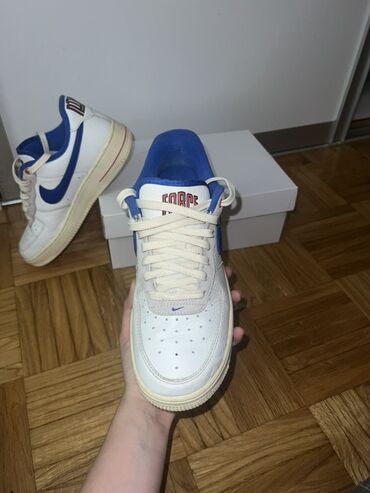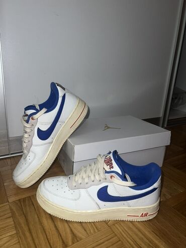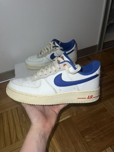 - Boje: bela baza sa plavim Swoosh logoom i plavim postavama, krem/žute pertle i đon; crveni detalji „AIR” na srednjem đonu i „FORCE” na jeziku