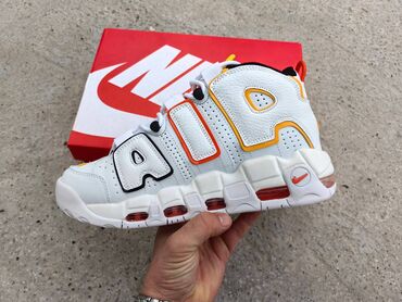 Nike Air More Uptempo patike – bele sa narandžastim i crnim detaljima.