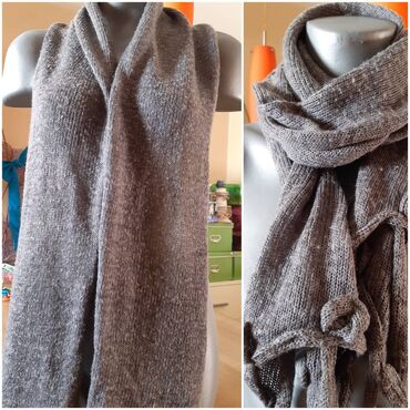 Pleten sivi šal sa dekorativnim trakama i čvorovima na krajevima. Mekana, lagana tkanina prijatna za nošenje, lako se kombinuje uz različite stilove. Može se nositi opušteno ili obmotati više puta oko vrata za dodatnu toplinu i efekat.
