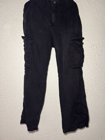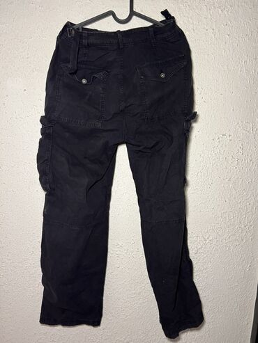 Drugi materijalUnisex cargo pantalone u crnoj boji, idealne za svakodnevno nošenje. Karakteriše ih ravni kroj i pojas sa gajkama za kaiš, što omogućava prilagođavanje obima struka. Pantalone imaju dva bočna džepa za ruke, dva dodatna džepa sa preklopom na butinama i dva zadnja džepa sa dugmadima, pružajući dovoljno prostora za odlaganje sitnica. Dizajnirane su za udobnost i funkcionalnost, pogodne za opuštene aktivnosti i aktivnosti na otvorenom. Brend: Bershka.
