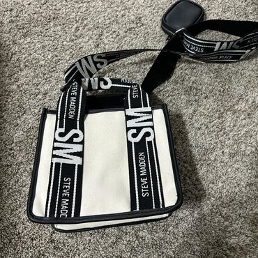 - Dizajn: kontrastne crno‑bele trake sa natpisom “STEVE MADDEN / SM”; kratke ručke + širok, podesiv, odvojiv kaiš za nošenje preko ramena/koso