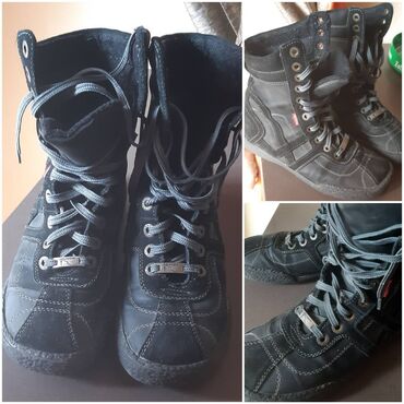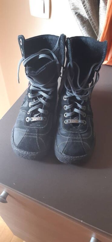 Zimske patike/čizme sa toplom postavom - Model: viši kroj do iznad članka, sa klasičnim pertlanjem i metalnim kukicama za dodatno učvršćenje - Boje: crna sa sivim đonom i braon (kamel) sa belim de...