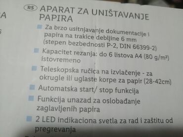 - Tip sečenja: trake širine 6 mm, nivo bezbednosti P-2 (DIN 66399-2)