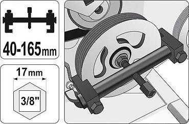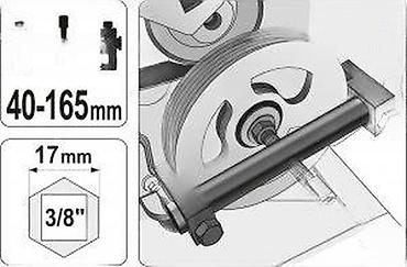 - Blokirati čeljusti na ivici remenice u odgovarajućem rasponu, poravnati centralni vijak sa osovinom i zatezati ključem 17 mm/3/8" dok se remenica ne oslobodi. Idealno za alternatore, servo pumpe, klime, male zupčanike i slične elemente.