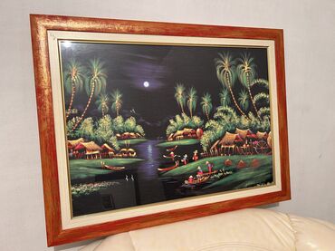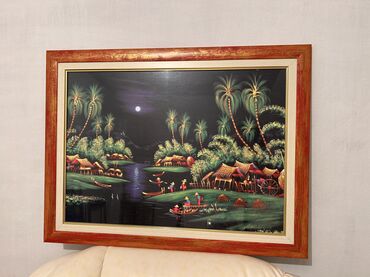 - Motiv: detaljna noćna scena sela na obali reke pod mesečinom; palme, kolibe od trske, čamci na vodi, ljudi u narodnim nošnjama, kola sa točkom, naslage sena. Bogata vegetacija i refleksija meseca u vodi.
