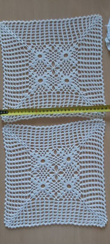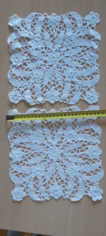 Ručni heklani stolnjaci i miljei – više modela - Tradicionalni ručni rad, nežna pamučna pređa u beloj/ekru nijansi - Motivi: cvetni i geometrijski (kvadrati, dijamanti, rozete) - Fini mrežasti vez...