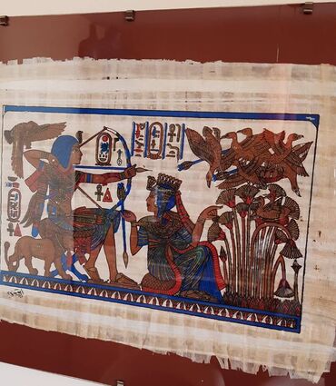 - Materijal slike: papirusni list sa ručno oslikanim detaljima i ornamentalnom bordurom.