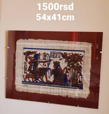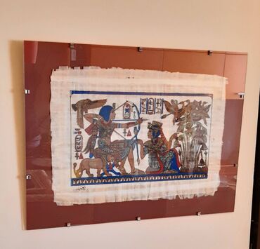 - Uokviravanje: papirus montiran između stakla/pleksiglasa sa metalnim distancerima; pozadinska ploča bordo/terakota nijanse.
