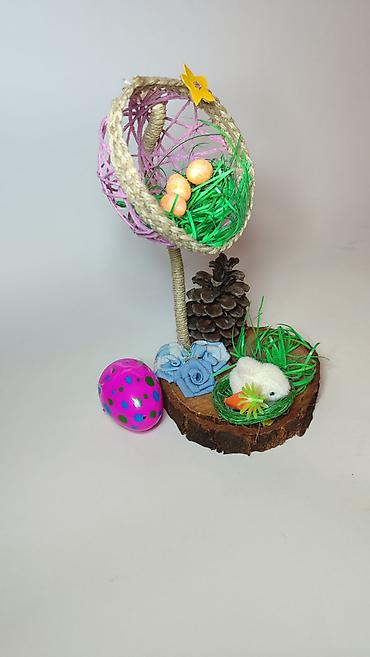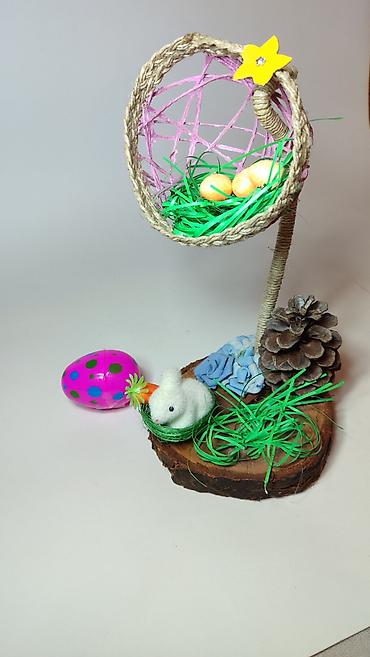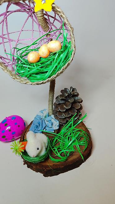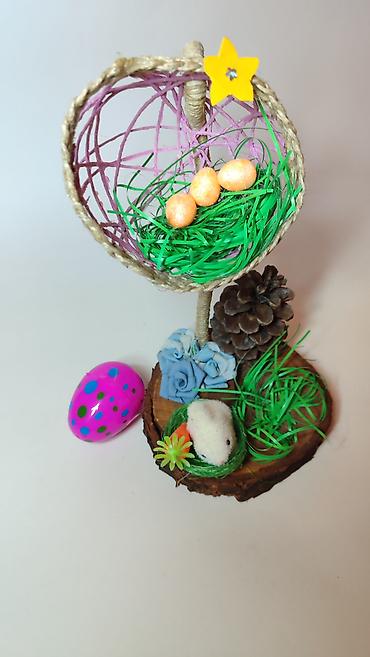 - Gornji deo čini poluotvorena sferna korpica od kanapa i konopca u svetloljubičastoj boji, sa ukrasnim žutim cvetom. Unutra je veštačka trava i tri dekorativna uskršnja jajeta sa šljokicama.