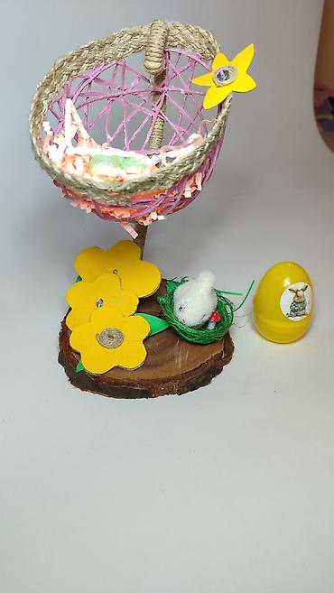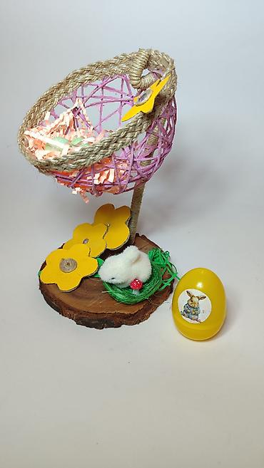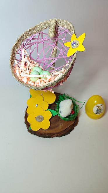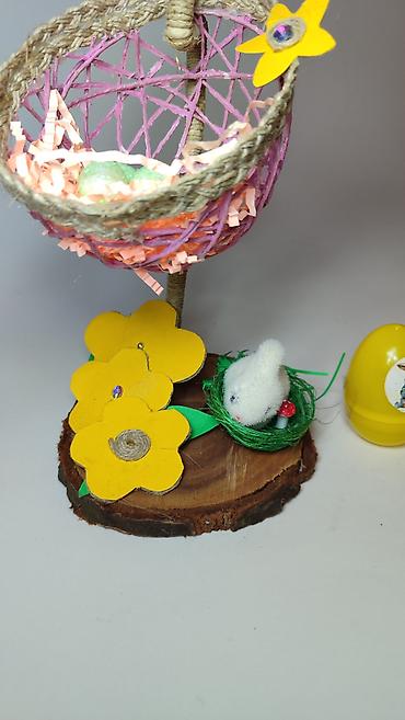 - Na drvenoj bazi nalaze se žuti kartonski cvetovi, zeleno „gnijezdo“ i mali plišani zeka sa minijaturnom pečurkicom.