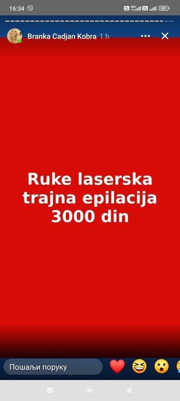 - Depilacija topla: ruke 650 din, noge 1.350 din