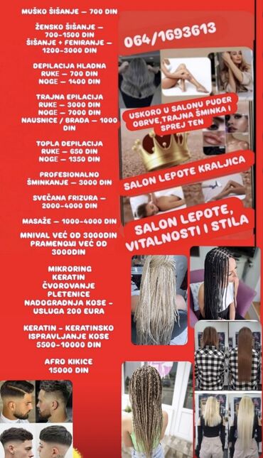 - Žensko šišanje: 700–1.500 din; šišanje + feniranje: 1.200–3.000 din