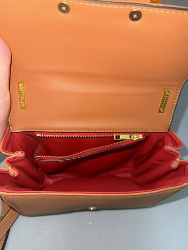 - Glatka prirodna koža u toploj karamel nijansi; kontrastna unutrašnjost u crvenoj boji