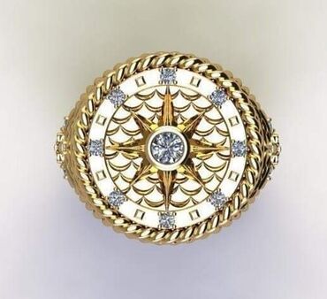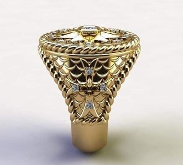 Masivni muški prsten – žuta boja metala, širokog profila. Prednja strana je blago zaravnjena sa ukrasnim gravurama: geometrijski motivi i centralni reljefni detalj u obliku trougla/„šrafa“, sa lini...