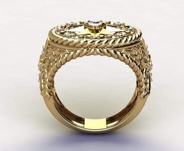 Masivni muški prsten – žuta boja metala, širokog profila. Prednja