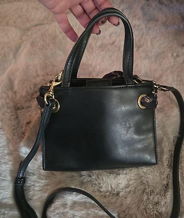 Torba je crne boje, izrađena od visokokvalitetne ekološke kože (PU koža) sa zlatnim logotipom brenda na prednjoj strani. Glavni ukras je odvojivi šal provučen kroz metalne prstenove na prednjem delu. Poseduje dve fiksne ručke i dugački, podesivi kaiš koji se može skinuti, što omogućava nošenje u ruci ili preko ramena. Fixne rucke spreda pri samom dnu su prelomljene i imaju tragove koriscenja, i pri dnu spreda dole levo, slikano je.