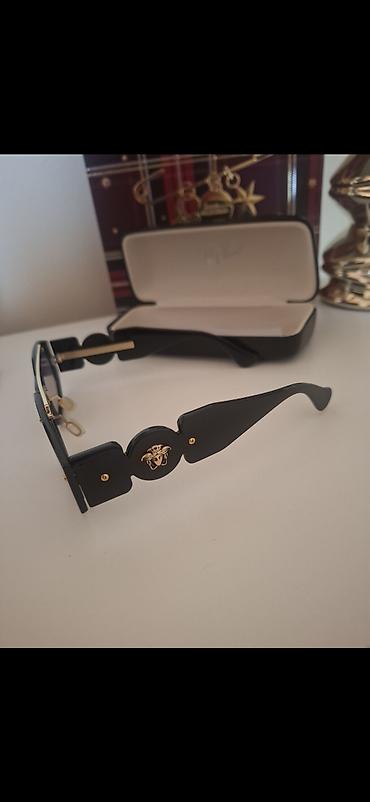 Versace sunčane naočare – pravougaoni/uskiji “flat-top” dizajn sa izrazitim debelim crnim okvirom. Prednja strana ukrašena zlatnim nitnama, a gornji most naglašen tankom zlatnom linijom. Stakla su u nijansi sivkasto-ljubičastog gradijenta (tamnije gore, svetlije dole) sa diskretnim Versace natpisom. Ručice su skulpturalne, široke, sa centralnim medaljonom – zlatna Meduza logo na obe strane, kao i zlatnim metalnim umecima duž unutrašnje strane. Nosnici su providni/komfortni.