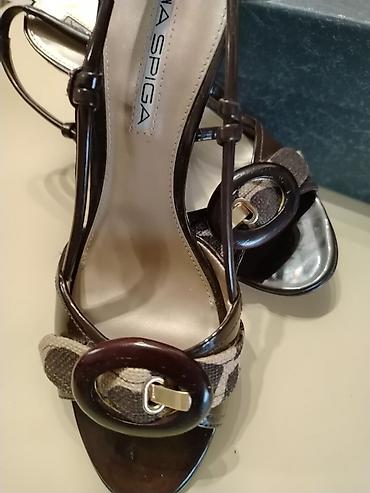 Elegantne sandale na štiklu sa sjajnim finišem i metalnim ukrasom -