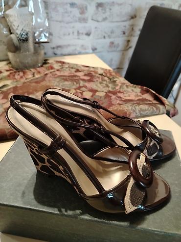 Ženske sandale na punu petu (platformu) – brend Celebrity. - Model: otvorene sandale sa kaišem oko zgloba i kopčom - Boja: braon sa metalik trakama u zlatno/bronza tonu - Gornjište: šire prednje t...