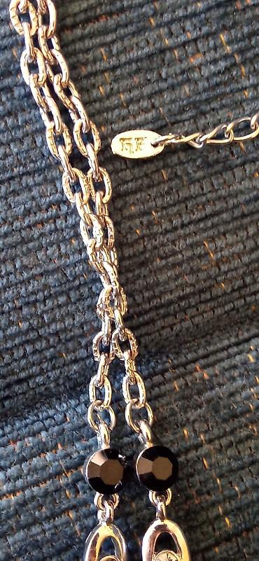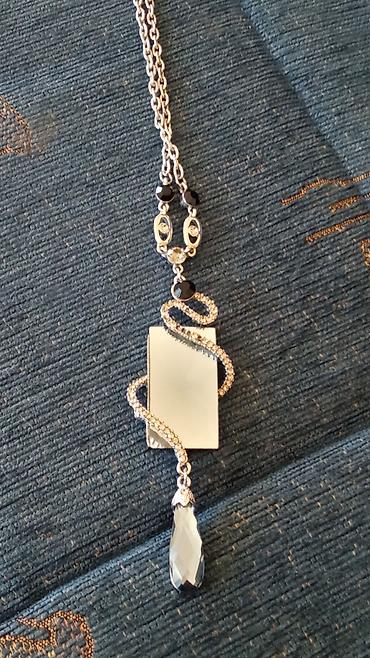 Ogrlica sa privjeskom u obliku srca, ukrašenim sitnim, svetlucavim kamenčićima. Lanac je tamno metalne boje (gunmetal), gušće pleten, sa klasičnom karabin kopčom. Ima produžni lančić za lako podeša...