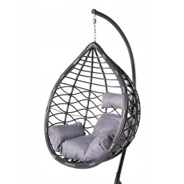 Viseća “egg” fotelja sa stalkom – idealna za terasu, dvorište ili dnevnu sobu.