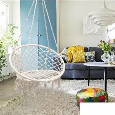 Viseća stolica sa stalkom – boho dizajn - Okrugla viseća stolica od čvrstog užeta u makrame stilu, sa resama. - Stabilan metalni ram A‑oblika, obložen za dodatnu izdržljivost i sigurnost. - Dvostr...5 000 RSD