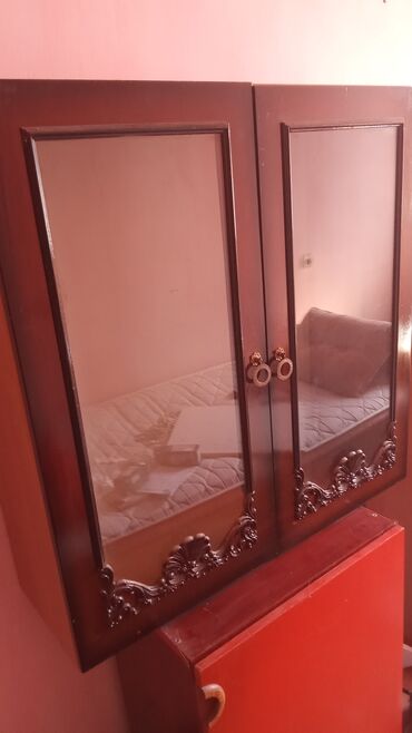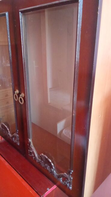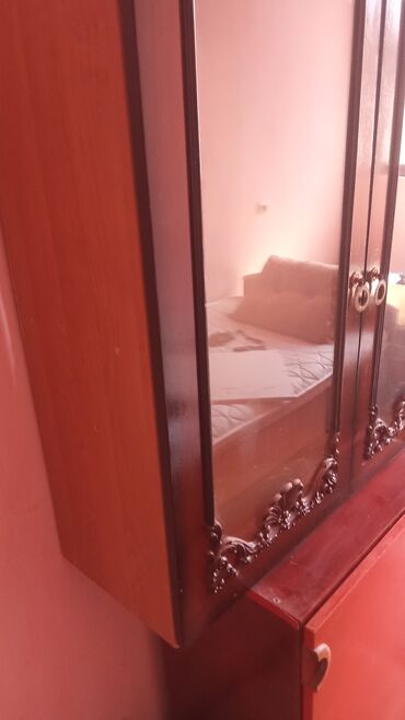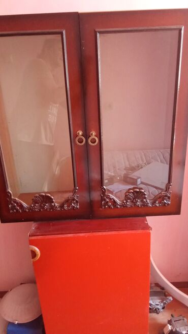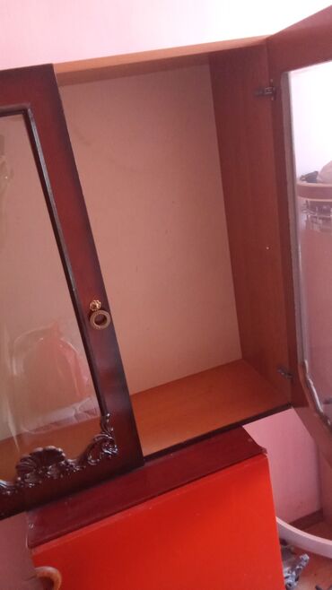 Ugaona komoda 80 x 130 cm, visina 70 cm. Izrađena u kombinaciji drveta i šperploče. Boja: trula višnja. Karakteristike: - Trokutasta (za ugao), sa širokom gornjom pločom - Više otvorenih polica: c...