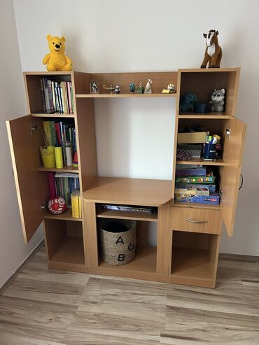 - Dve visoke zatvorene police sa vratima (levo i desno) sa unutrašnjim pregradama za uredno odlaganje knjiga, školskog pribora, igračaka ili dokumenata.