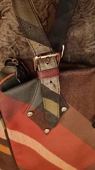 - Materijal: izdržljivo platno sa prepoznatljivim višebojnim dijagonalnim kariranim dezenom; ojačani uglovi i rubovi