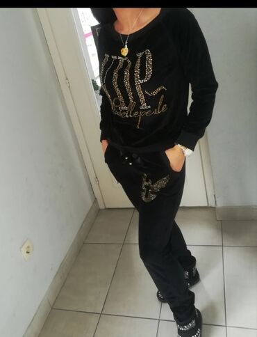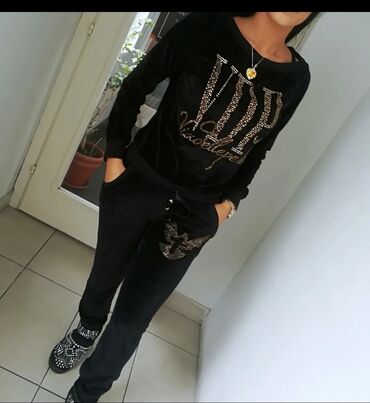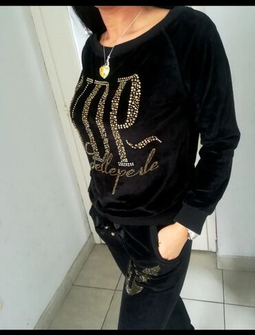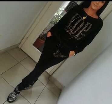 Crni ženski komplet – veličina S - Dvodijelni set: dukserica dugih rukava + donji deo sa elastičnim pojasom i učkurom - Materijal: mekana, prijatna trenerka tkanina - Kroj: opušten gornji deo, rav...