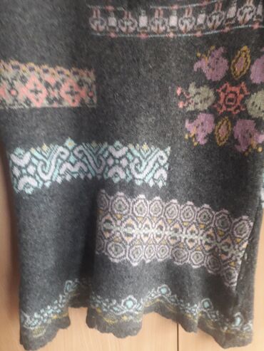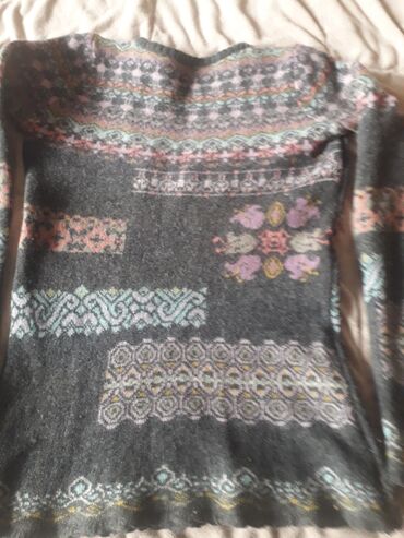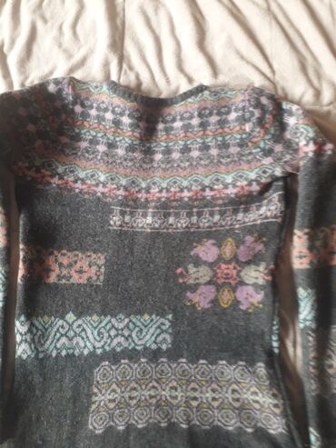 DomaćeVuneni ženski džemper, efektan, kvalitetan i mek, 80% vuna, dužina 65cm, prati liniju tela, tamno siva podloga sa prelepim detaljima u plavim, roze, ljubicasto, zelenim tonovima