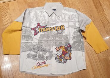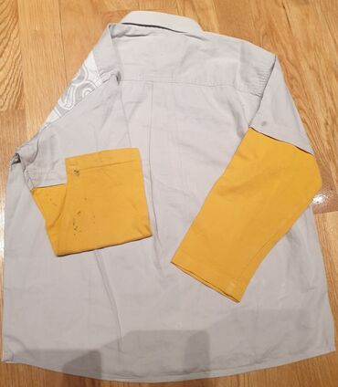 Waikiki decija kosulja za decake. 110 cm, 5 god, ali veća. Moderna, smekerska. Rukavi su kao dux. Kombinacija bež i sive boje, sa zutim rukavima. Sa aplikacijom napred. Broj 5, za 5 - 6 godina. Mozda 2x nosena. Bukvalno kao nova, osim fleke na rukavu od tempere mislim.
