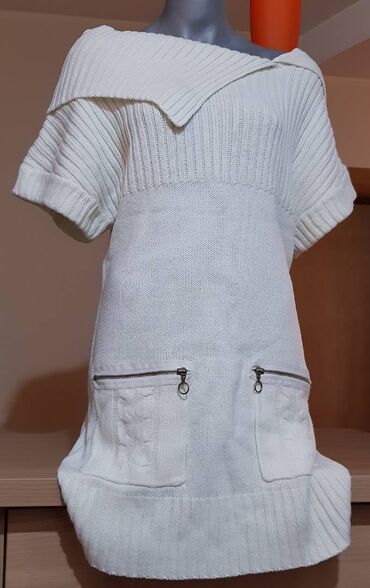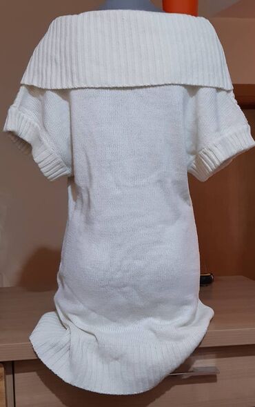 - Model: duža tunika sa kratkim rukavima i širokim, spuštenim/rola okovratnikom koji se može nositi preko ramena