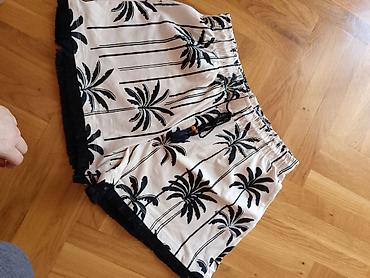 - Šorts: svetla bež podloga sa crnim printom palmi; elastičan pojas sa učkurom i kićankama; dekorativna crna čipkana ivica duž nogavica