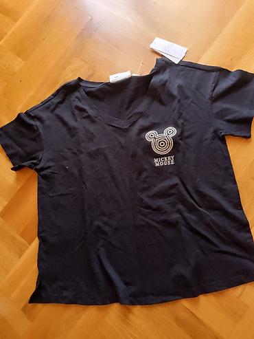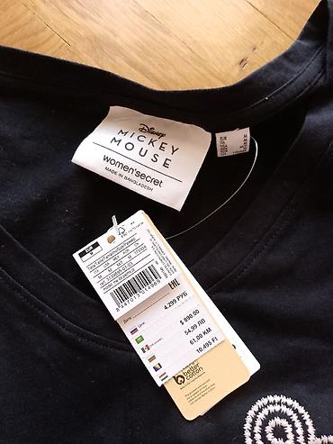 - Majica: crna, V-izrez; napred mali motiv Mickey Mouse sa koncentričnim krugovima i natpis “MICKEY MOUSE”; etiketa sa više valuta; Better Cotton inicijativa naznačena na kartici