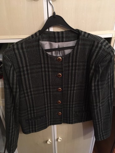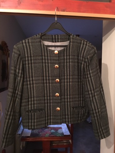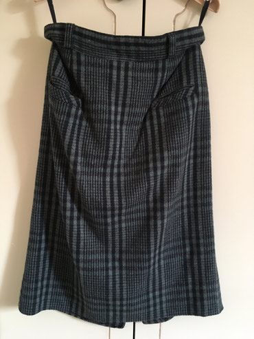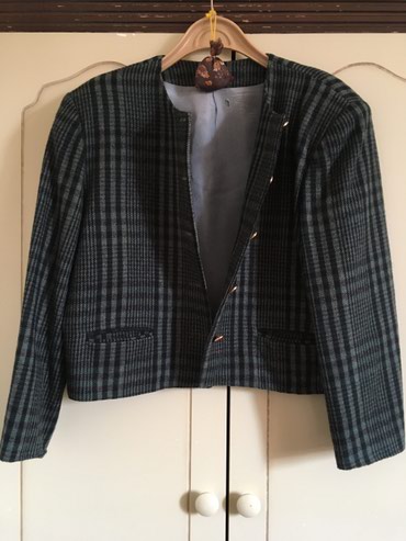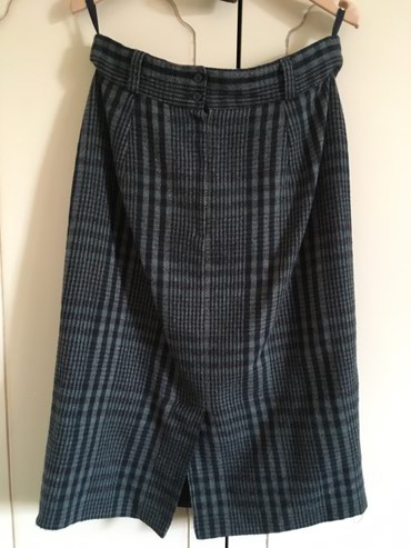 Komplet suknja i sako od čiste runske vune, postavljeni, veličina 42. Dužina suknje je 70cm, širina kukova 96cm, struk 76cm. Dužina sakoa je 50cm, širina ramena 47cm, dužina rukava 55cm, grudi 110cm. Suknja pokriva kolena, a sako je malo ispod struka. Suknja ima male džepove napred i mali šlic pozadi. Tamnije zelene boje sa neupadljivim crnim linijama.