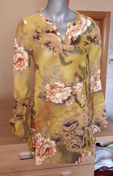 Ženska tunika/bluza u žutoj boji sa sitnim cvetnim printom sprijeda. - Kroj: lepršavi šišmiš rukavi, asimetričan donji rub sa dužim krajevima sa strane. - Dekolte: V-izrez napred sa ukrasnim nabo...