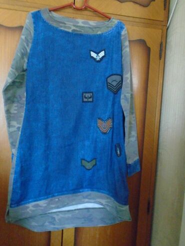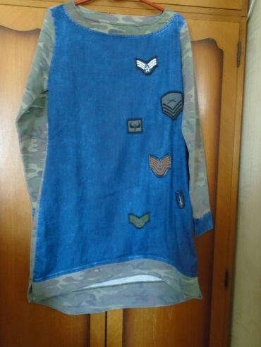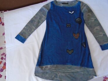 Zanimljiva sportska kao duks haljina, proizvedena u Turskoj, napred teksas sa aplikacijama, pozadi masakirni materijal koji deluje kao ispran, iako je haljina jednom ili nijednom nošena i oprana. Tako je izgledala i kad je kupljena. Naznačena je L veličina. Veoma praktična i prijatna za nošenje.