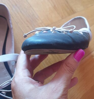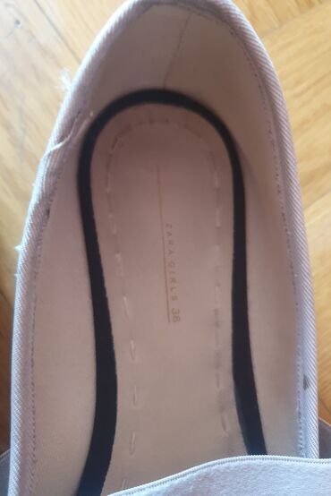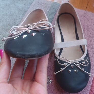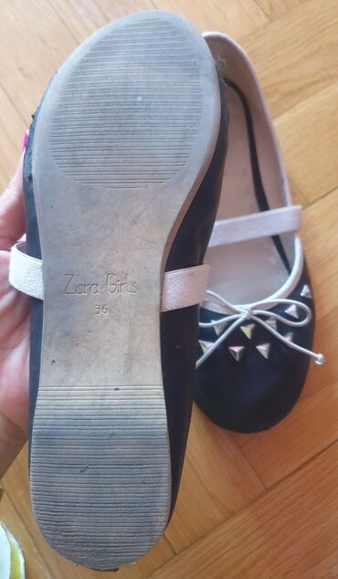 0ZARA girls baletanke za devojcice broj 36. Crne boje sa bež mašnom i nitnama. Oko zgloba imaju lastiš da ne ispadaju tokom nosenja. Izguljene pri samom djonu, skroz dole, pa pri nosenju nije vidljivo osim kad gledate pravo u njih. Jedna vise jedna manje. Odgovaraju broju.