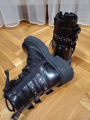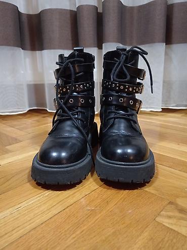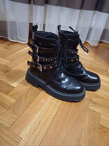 Dečje/ženske crne gležnjače sa dekorativnim kaišem i metalnom kopčom. BrojeviOd 24 do 36. Vodootporne. Model sa izraženim đonom i blagom platformom za bolju stabilnost. Gornjište kombinacija glat...