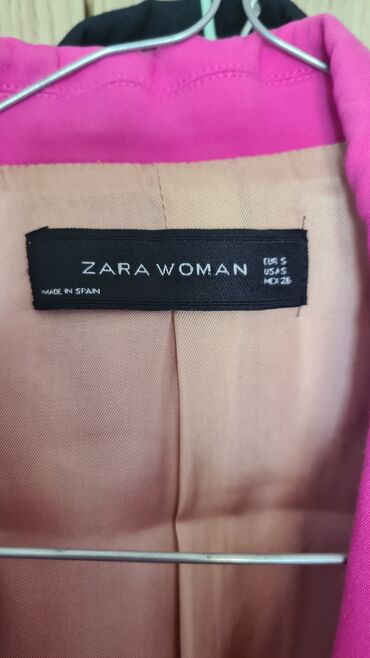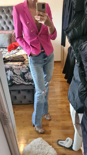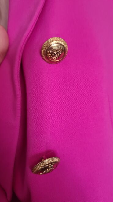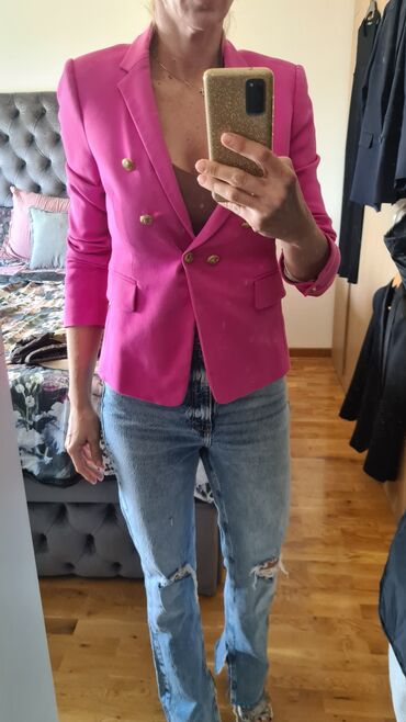 ZARA ženski blejzer – fuksija/bonbon roze nijansa - Model: duži blejzer sa pojačanim ramenima i klasičnim reverima - Kopčanje: dvoredno, dva dugmeta napred - Džepovi: dva ušivena prednja džepa - P...
