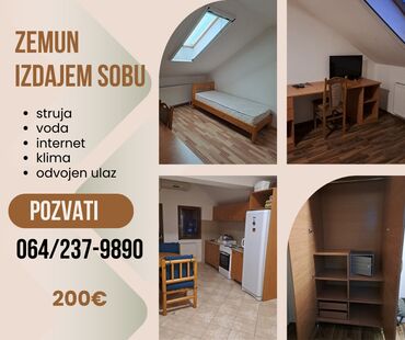 Zemun, naselje Nova galenika, izdajem sobu,za studenta ili mlađu zaposlenu osobu u sklopu stana u potkrovlju porodične kuće sa zasebnim ulazom. Par stanica od Visoke medicinske škole i Policijske akademije, kao i Poljoprivrednog fakuteta. Autobusi 84,612. Cena 200€. U cenu su uračunati , struja, voda,grejanje, katv, klima, internet. Plaćanje mesečno depozit obavezan.