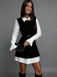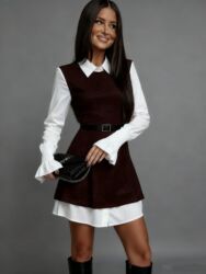 Elegantna ženska haljina A-kroja sa efektnim slojevitim izgledom — gornji deo bez rukava u kombinaciji sa belom košuljom ispod. Kontrastni beli košulja-rukavi sa naborima i blago zvonastim manžetnama, klasična bela kragna i dekorativni pojas u struku naglašavaju siluetu. Spoljašnji sloj je nežno teksturisan sitnim tačkicama, dok donji rub košulje diskretno viri ispod haljine za moderan, chic izgled. Dostupna u više boja: bež, tamno braon, crna i bordo. Idealna za posao, svečane prilike i večernje izlaske.