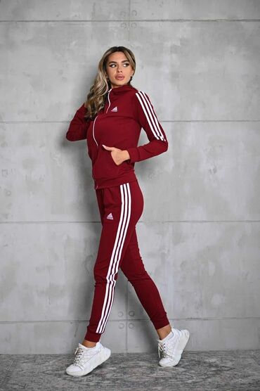 Ženska trenerka sa kapuljačom i dugim rukavima, savršena za sport i slobodno vreme. Gornji deo ima rajsferšlus duž cele dužine i dva bočna džepa, pružajući praktičnost. Donji deo trenerke ima elastičan pojas i manžetne na nogavicama za udobno pristajanje. Prepoznatljive tri bele pruge nalaze se duž rukava i bočnih strana nogavica, dok je Adidas logo vidljiv na grudima i butini. Izrađena je od udobnog materijala, pogodna za svakodnevno nošenje i razne aktivnosti.