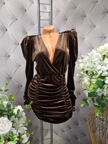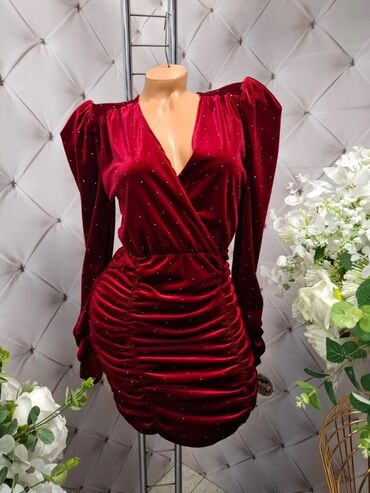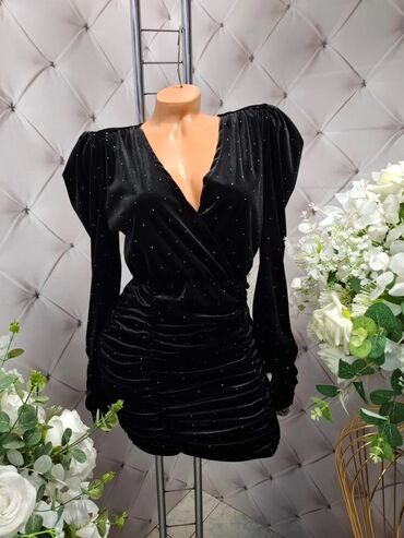 Elegantna ženska mini haljina od baršuna sa sjajnim mikro-cirkonima. Model sa preklopljenim V izrezom i naglašenim ramenima, dugi rukavi sa blagim puf efektom. Struk je blago nabrane konstrukcije koja vizuelno oblikuje figuru, a donji deo je izrazito naboran sa bočnim šavovima i zaobljenim rubom za efekat „ruched“ siluete. Dužina iznad kolena.